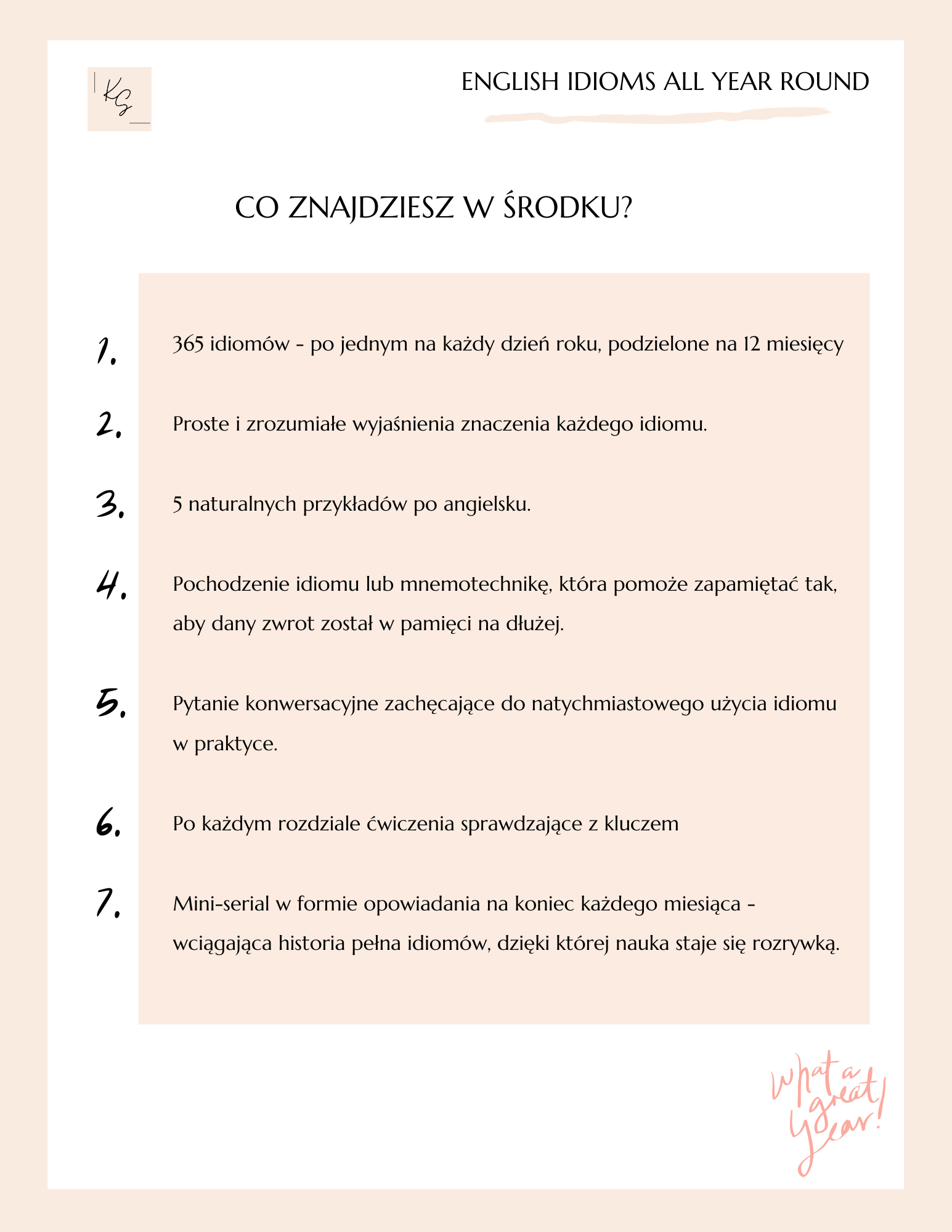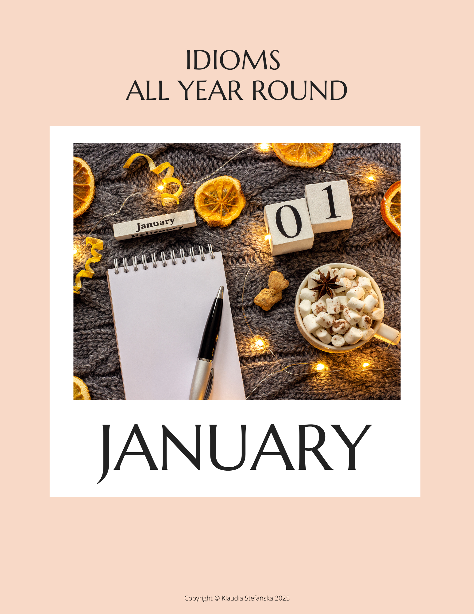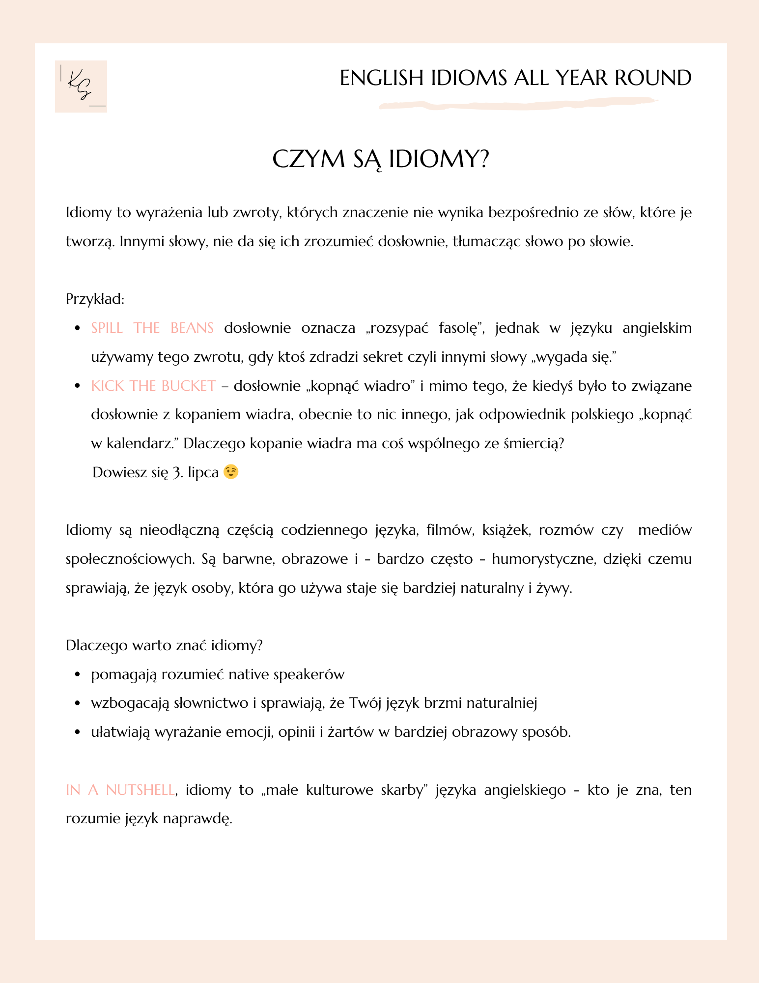 Właśnie dlatego powstał mój nowy e-book: English Idioms All Year Round. To nie jest zwykły zbiór idiomów. To kompletny przewodnik po codziennym, naturalnym angielskim – rozpisany tak, by nauka była przyjemna i systematyczna.
