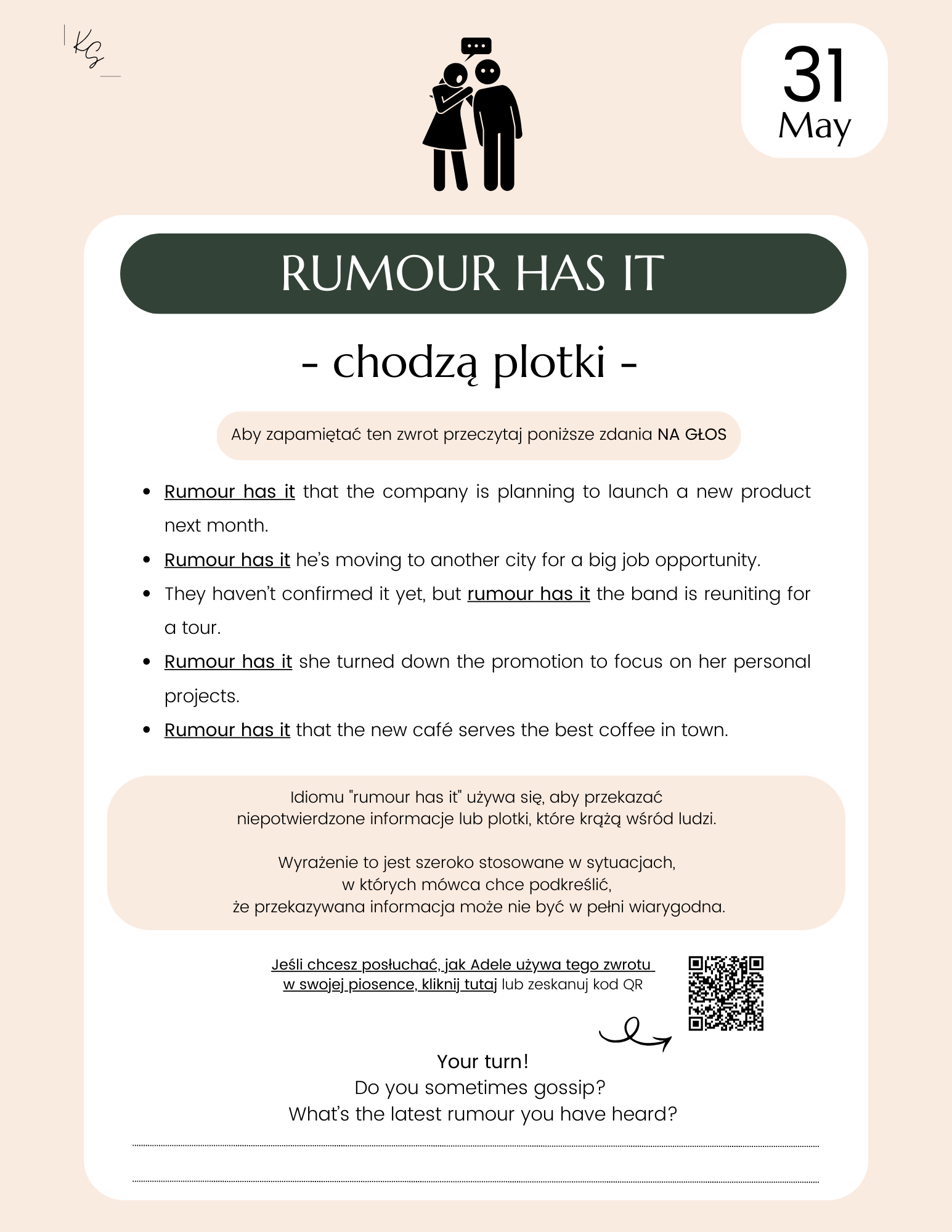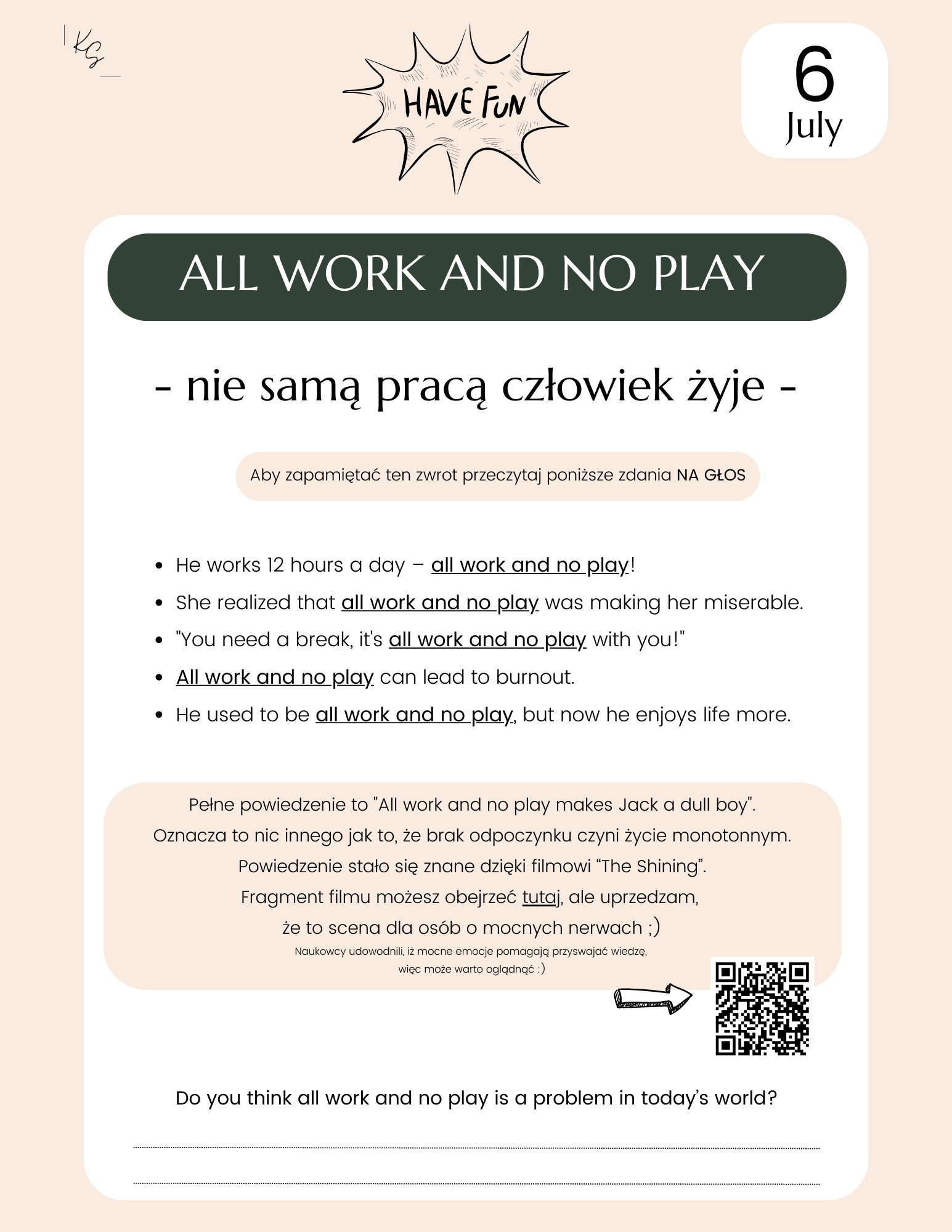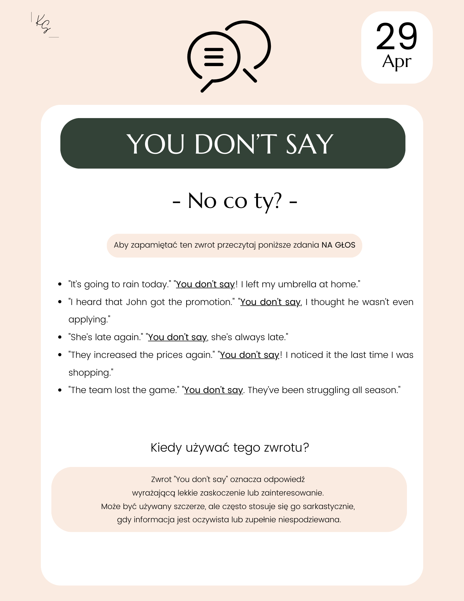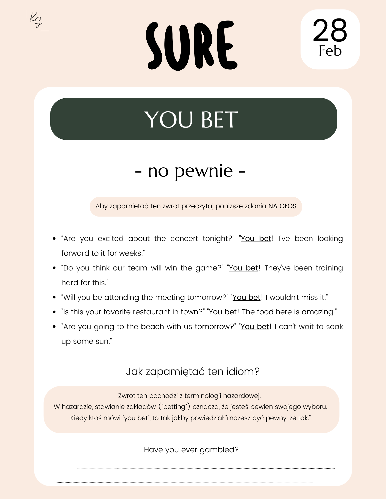- Pytanie konwersacyjne zachęcające do natychmiastowego użycia idiomu w praktyce.