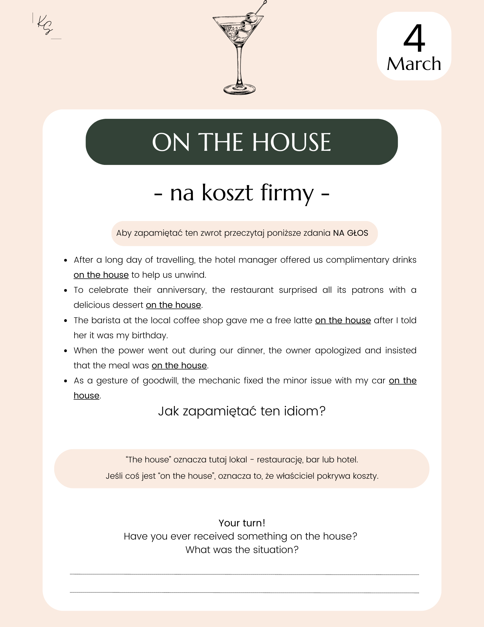 - Pochodzenie idiomu lub mnemotechnikę, która pomoże zapamiętać tak, aby dany zwrot został w pamięci na dłużej.